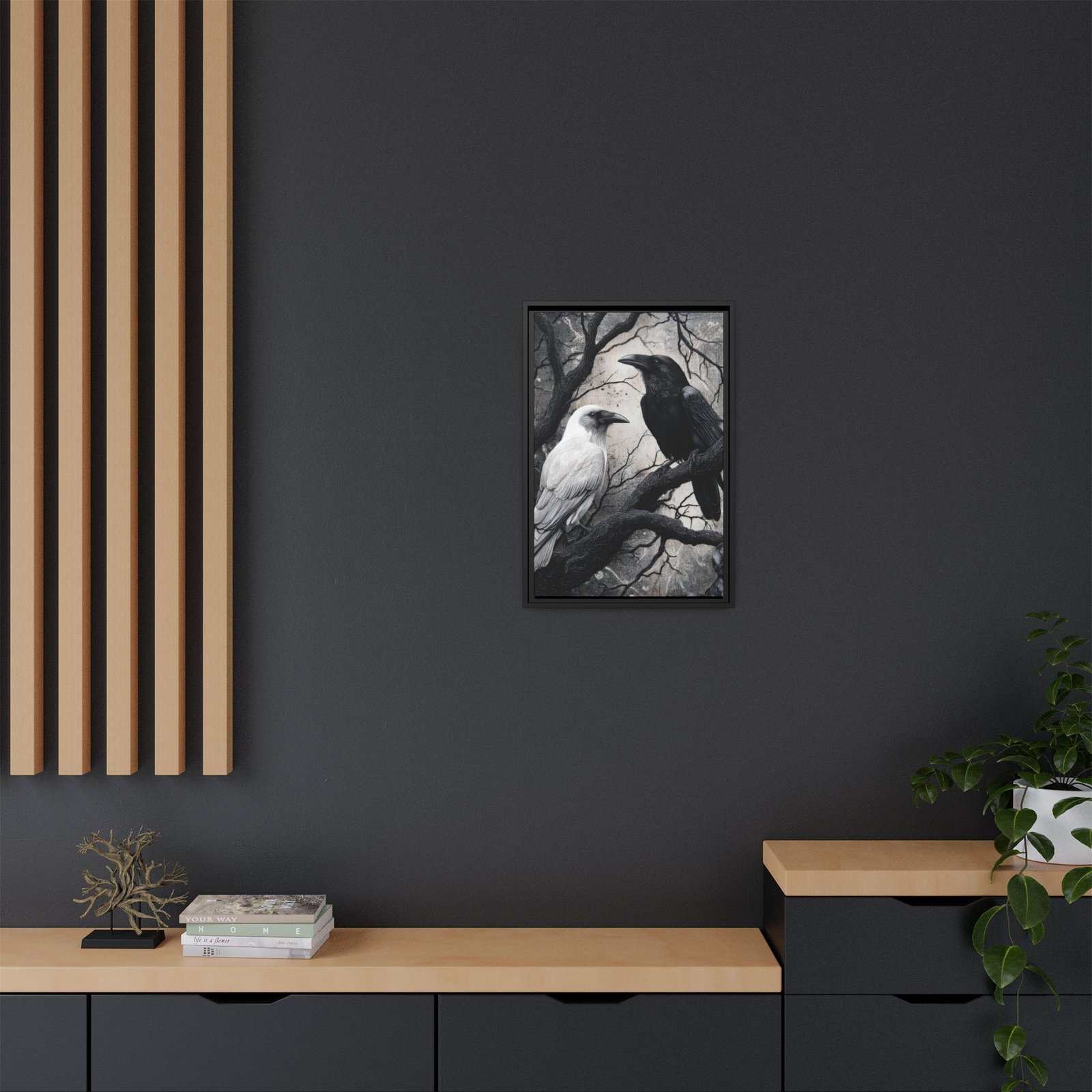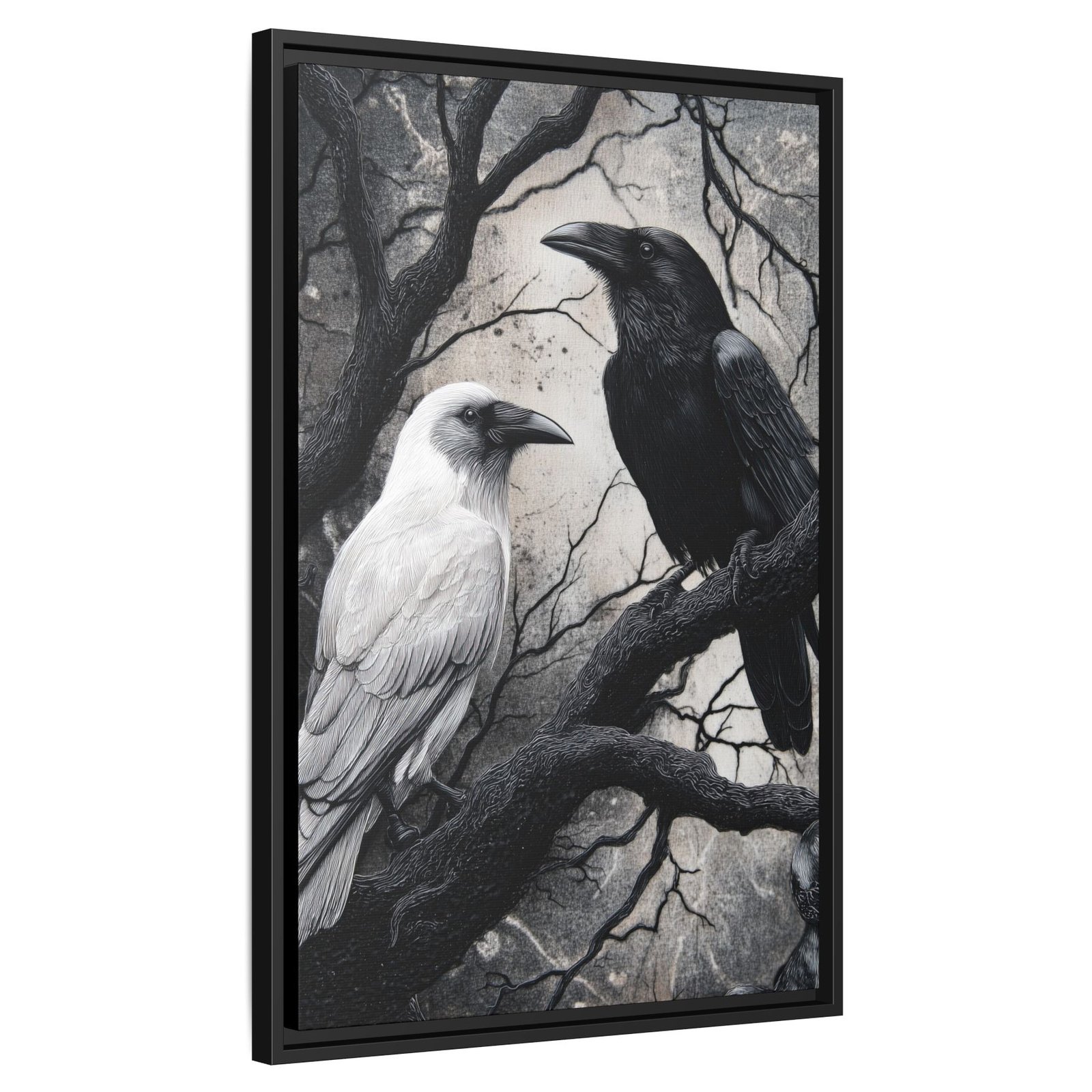 A striking gothic art print featuring a black and albino white raven perched on twisted branches. Perfect for dark, nature-inspired decor or gothic wall art collections.