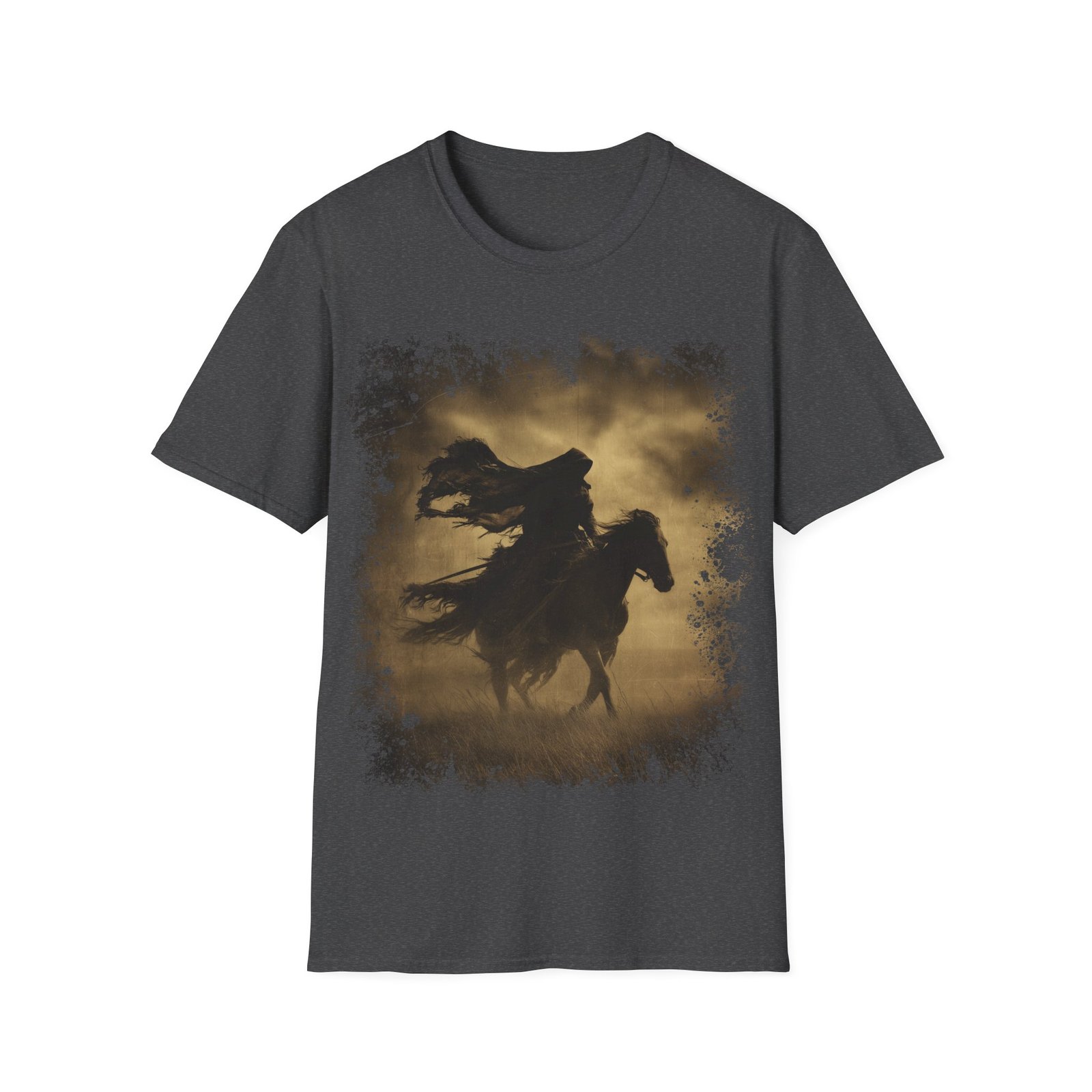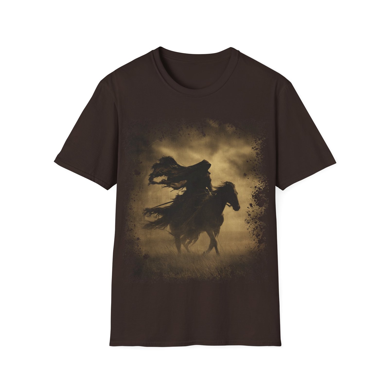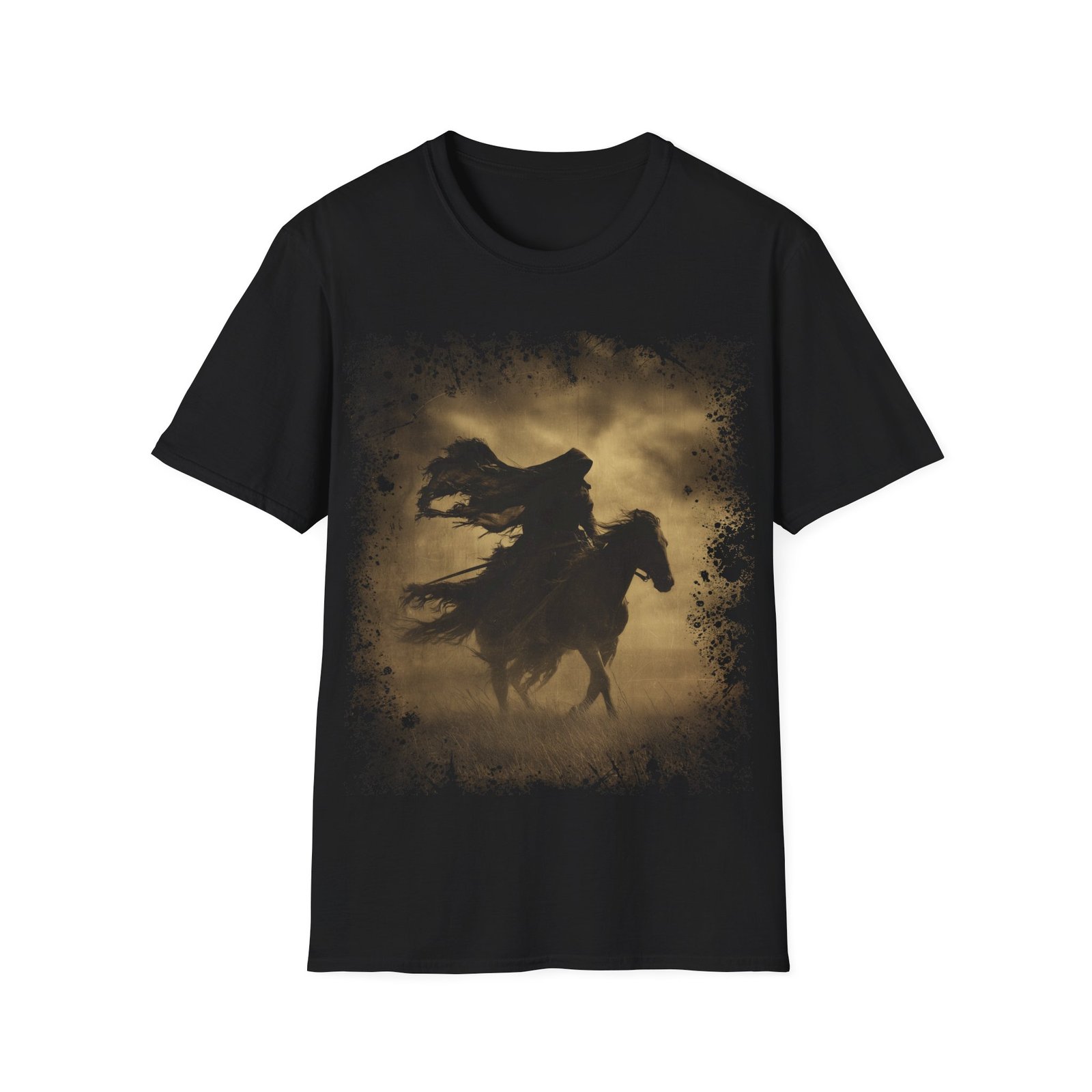 This striking T-shirt showcases a powerful silhouette of a lone rider on horseback, captured mid-motion beneath a darkened sky. Rendered in warm sepia tones, the artwork evokes the feel of an aged frontier photograph, blending western grit with gothic atmosphere.