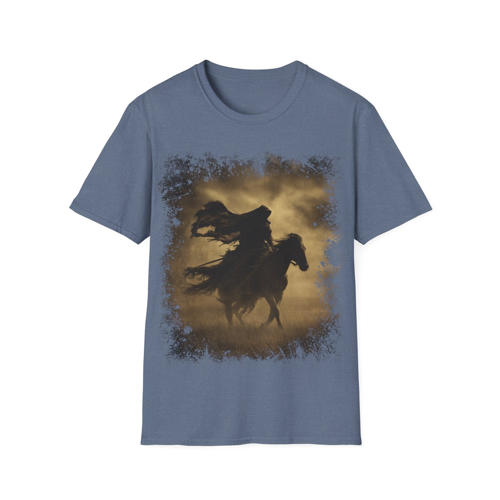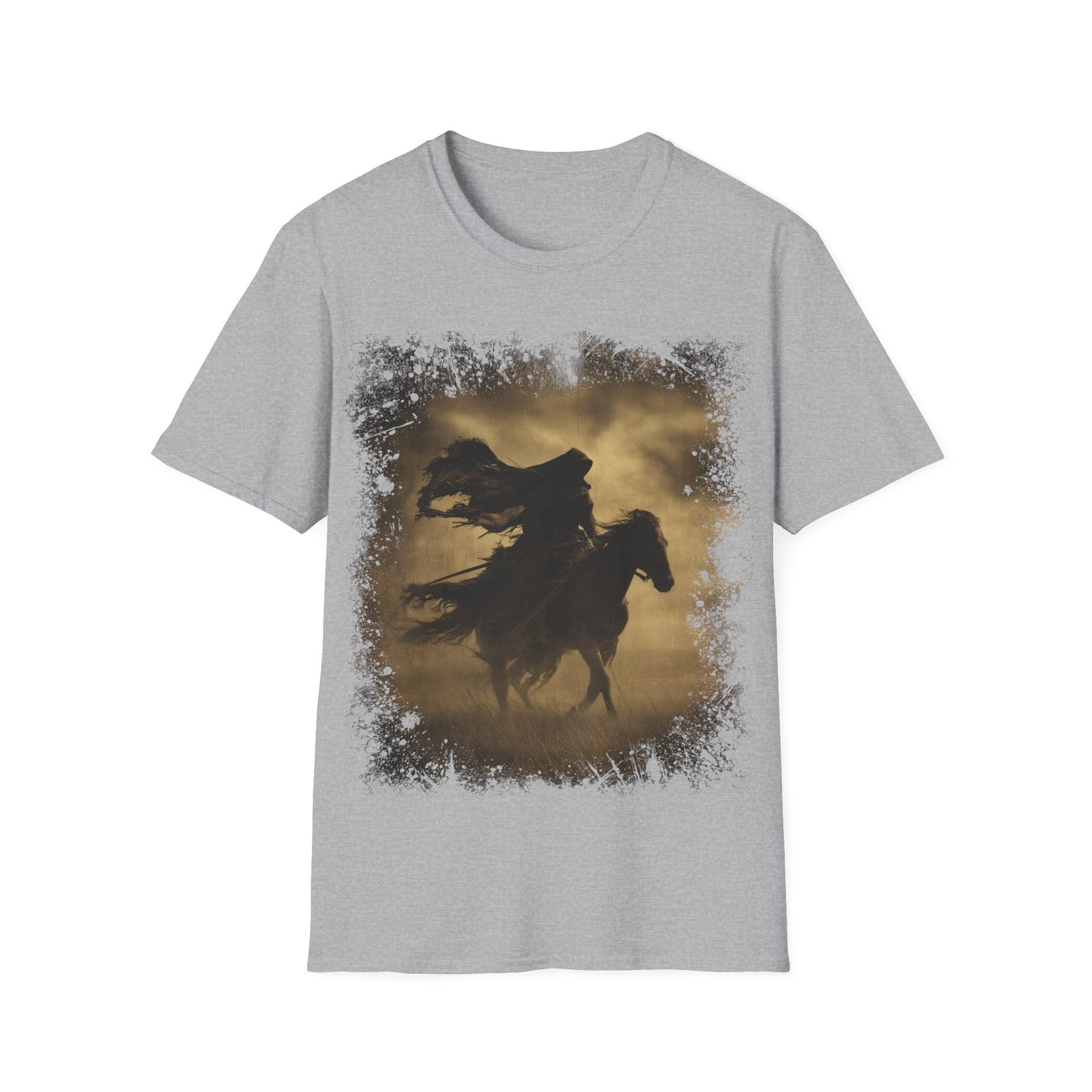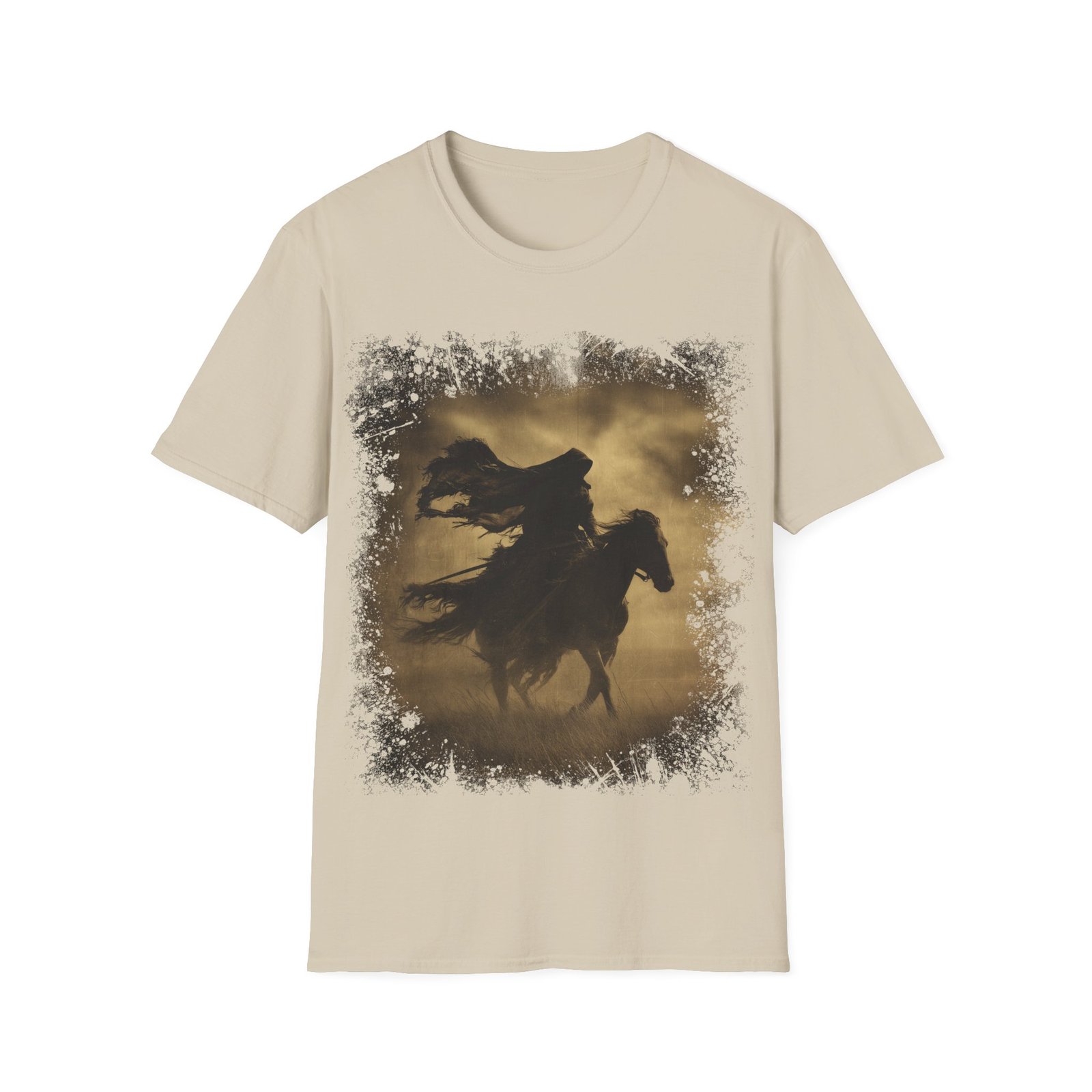 This striking T-shirt showcases a powerful silhouette of a lone rider on horseback, captured mid-motion beneath a darkened sky. Rendered in warm sepia tones, the artwork evokes the feel of an aged frontier photograph, blending western grit with gothic atmosphere.