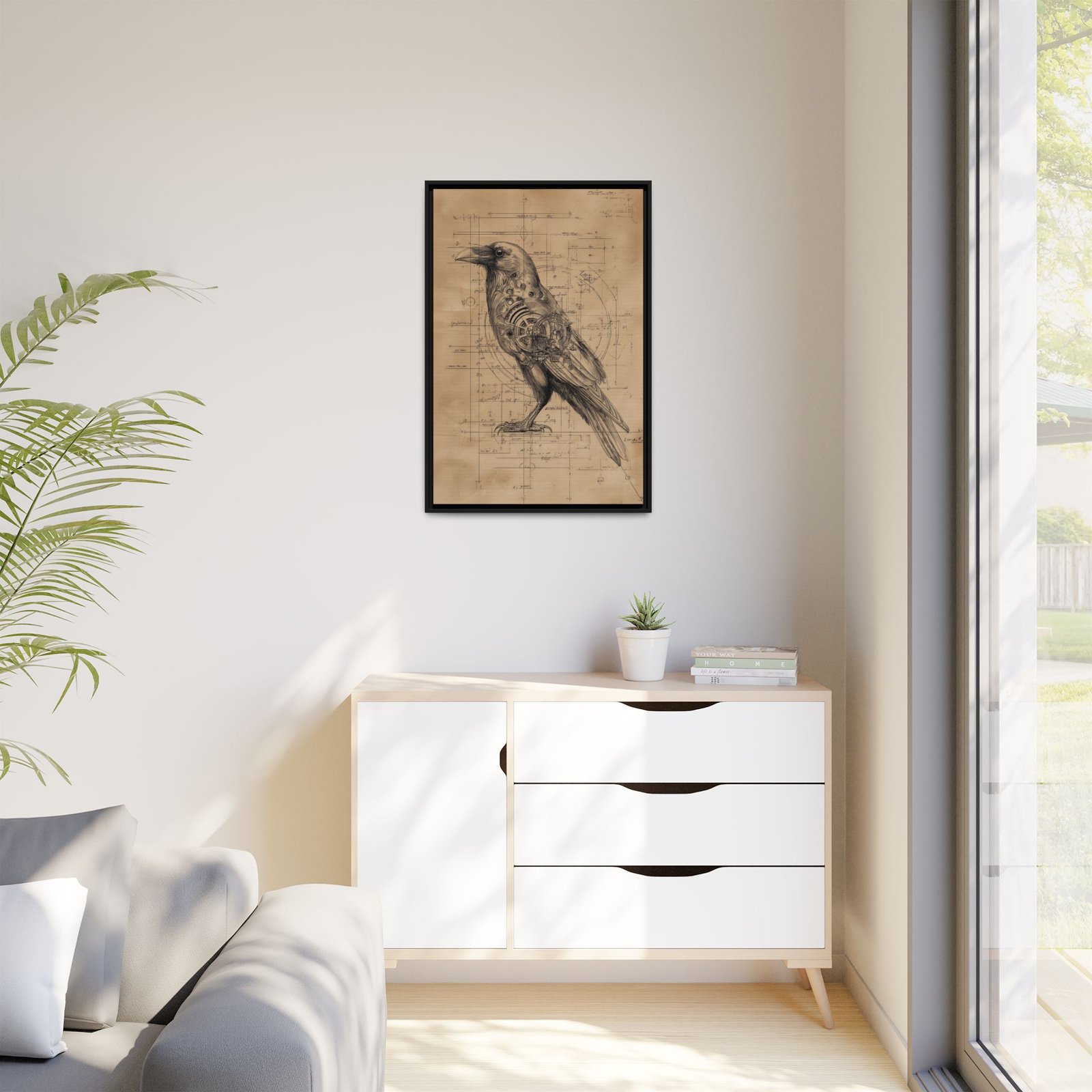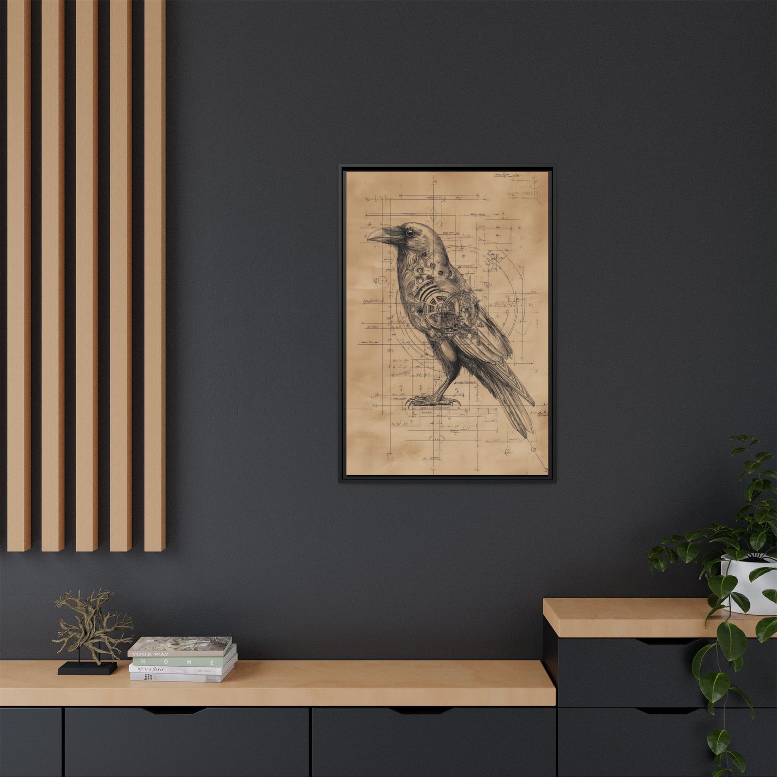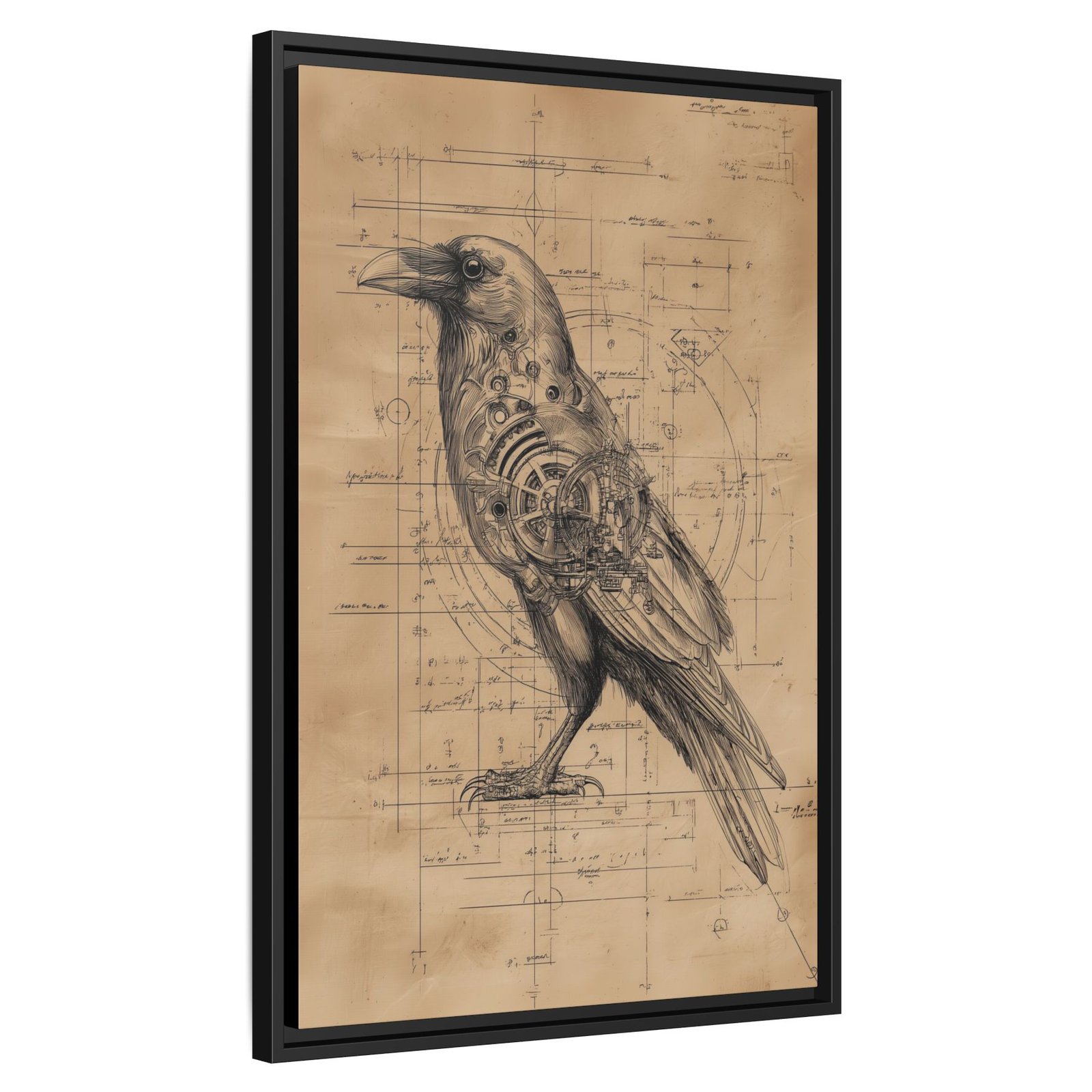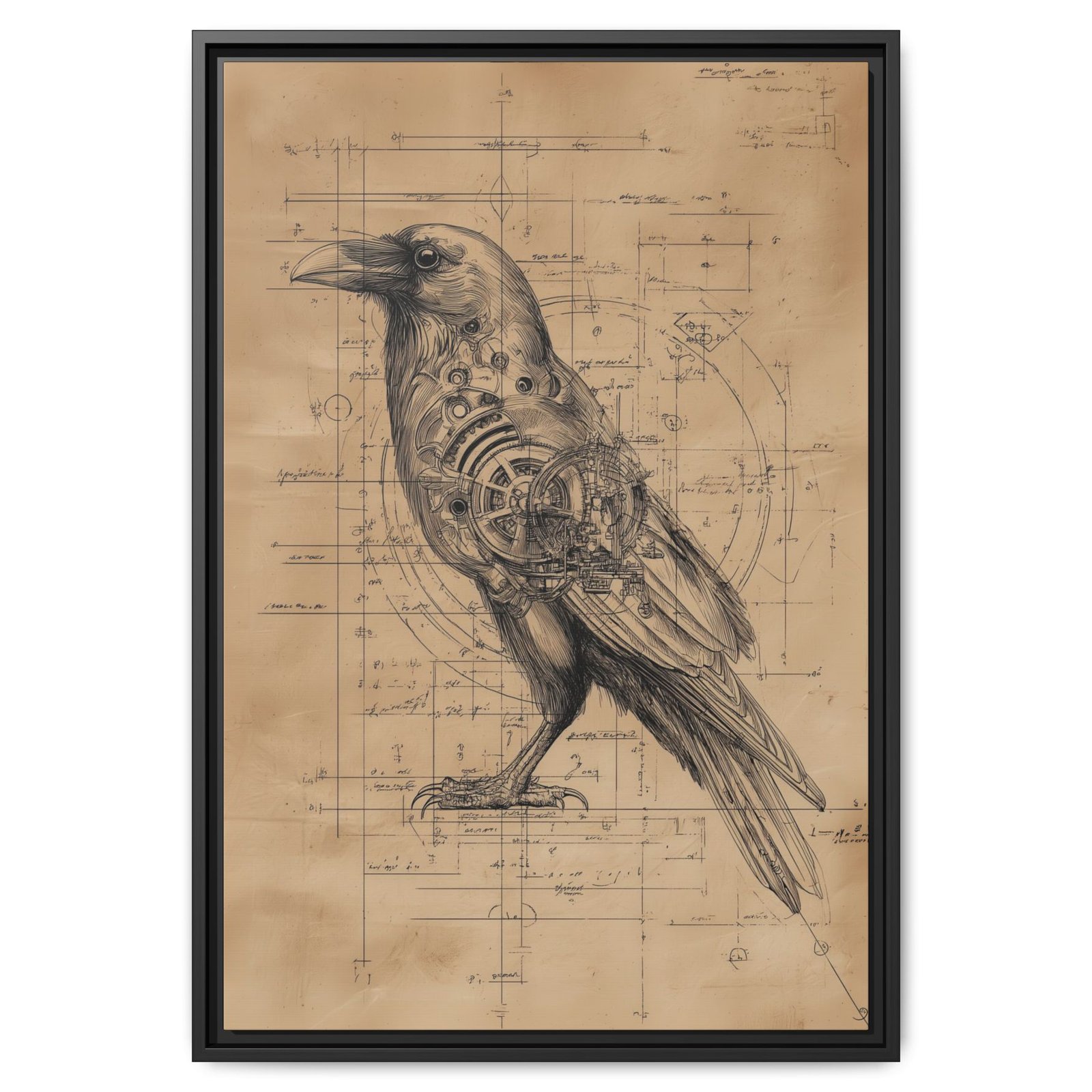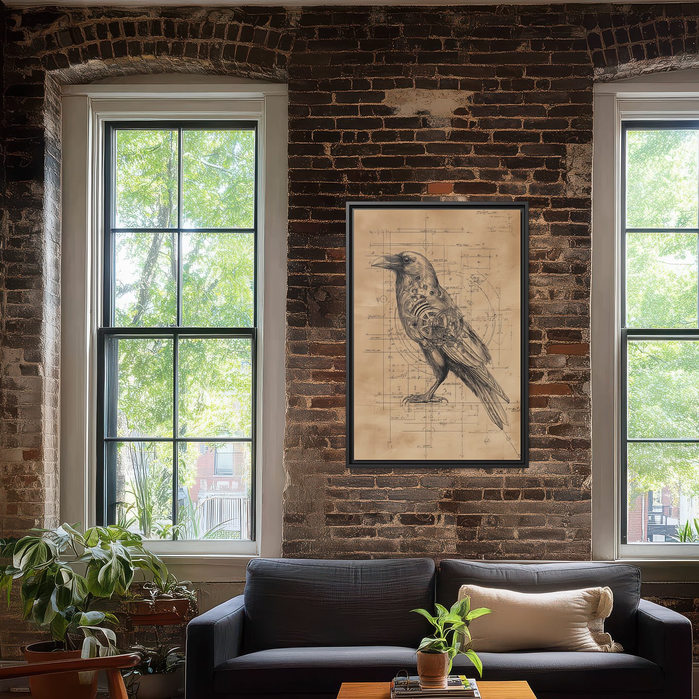 The style blends steampunk aesthetics, renaissance anatomical sketching, and industrial drafting — making it a statement piece for creative studios, libraries, loft-style living rooms, or dark academia spaces. Whether displayed as a fine art print or framed centerpiece, this raven blueprint adds personality, mystery, and craftsmanship to your décor.