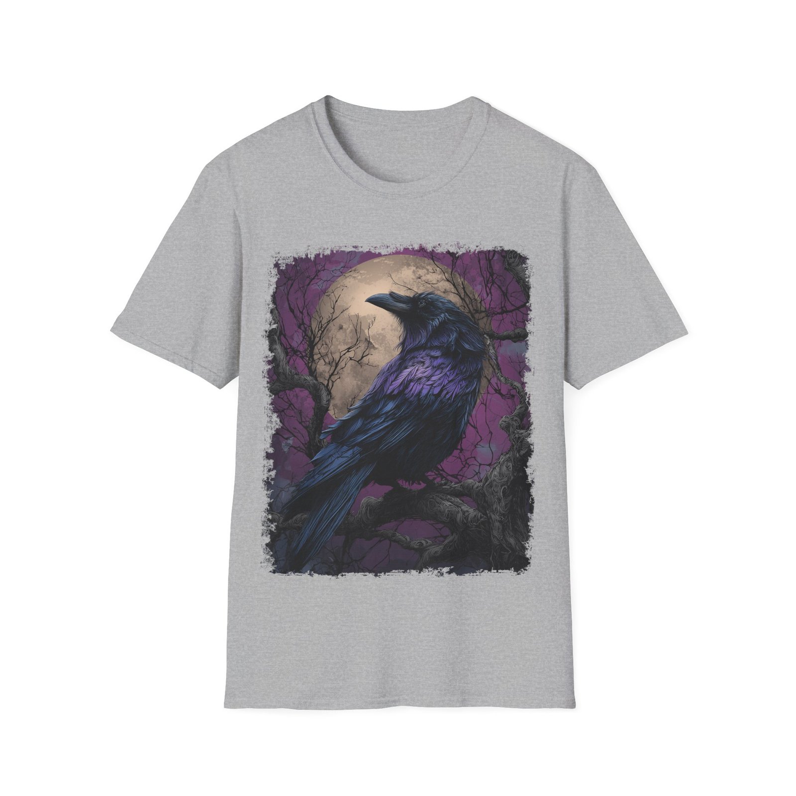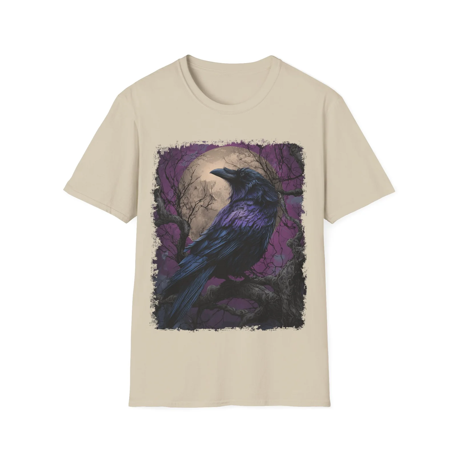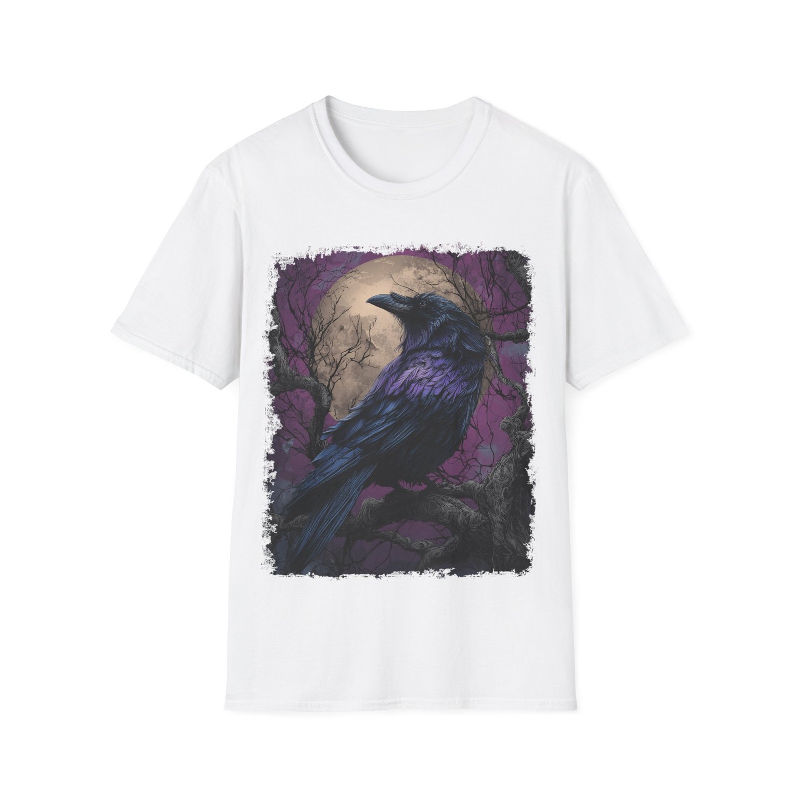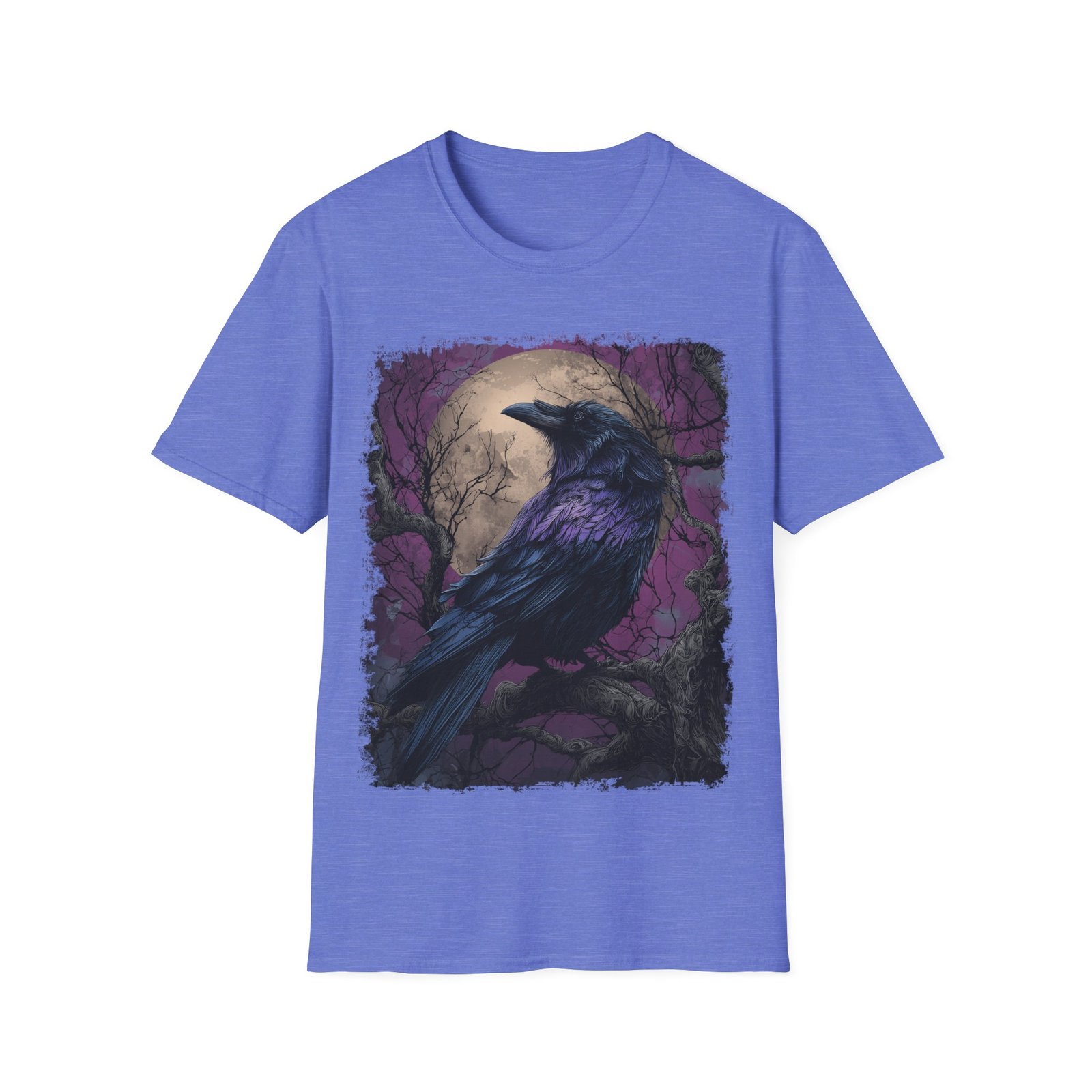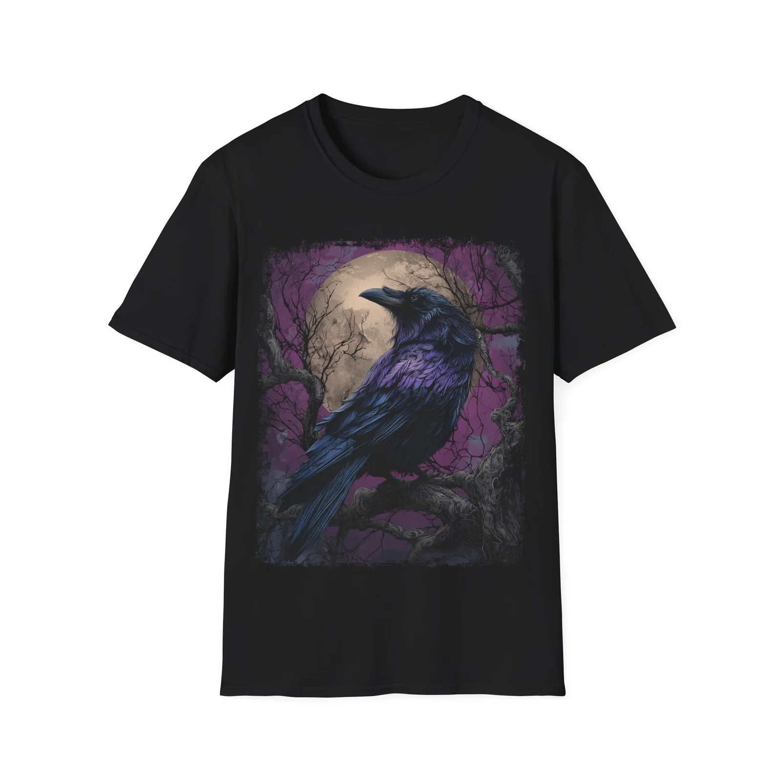 This eye-catching T-shirt features a beautifully detailed raven perched against a luminous full moon, framed by twisted branches and a deep violet night sky. The artwork blends rich purples and inky blues, giving the feathers a dimensional, almost iridescent glow that stands out dramatically against the softer lunar backdrop.