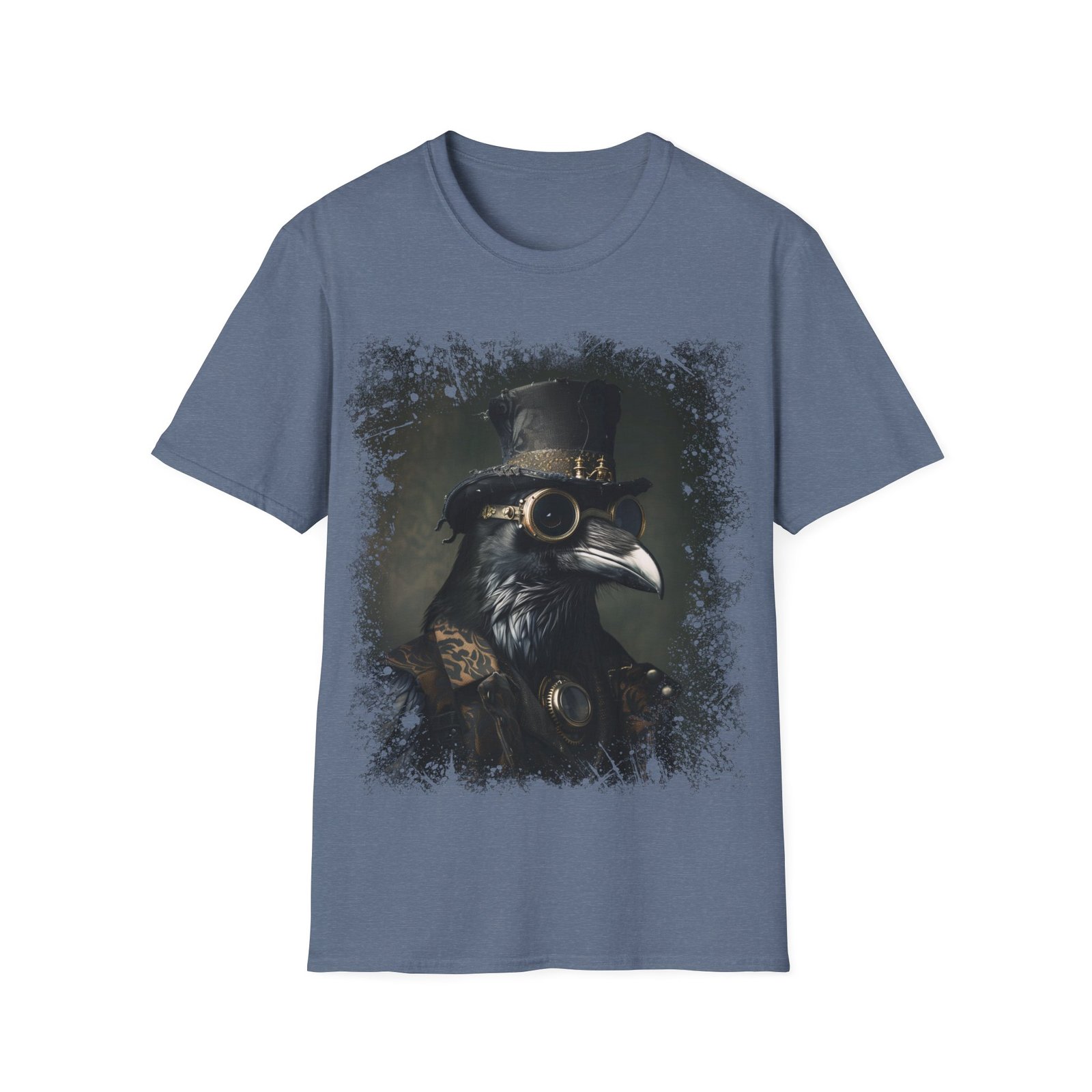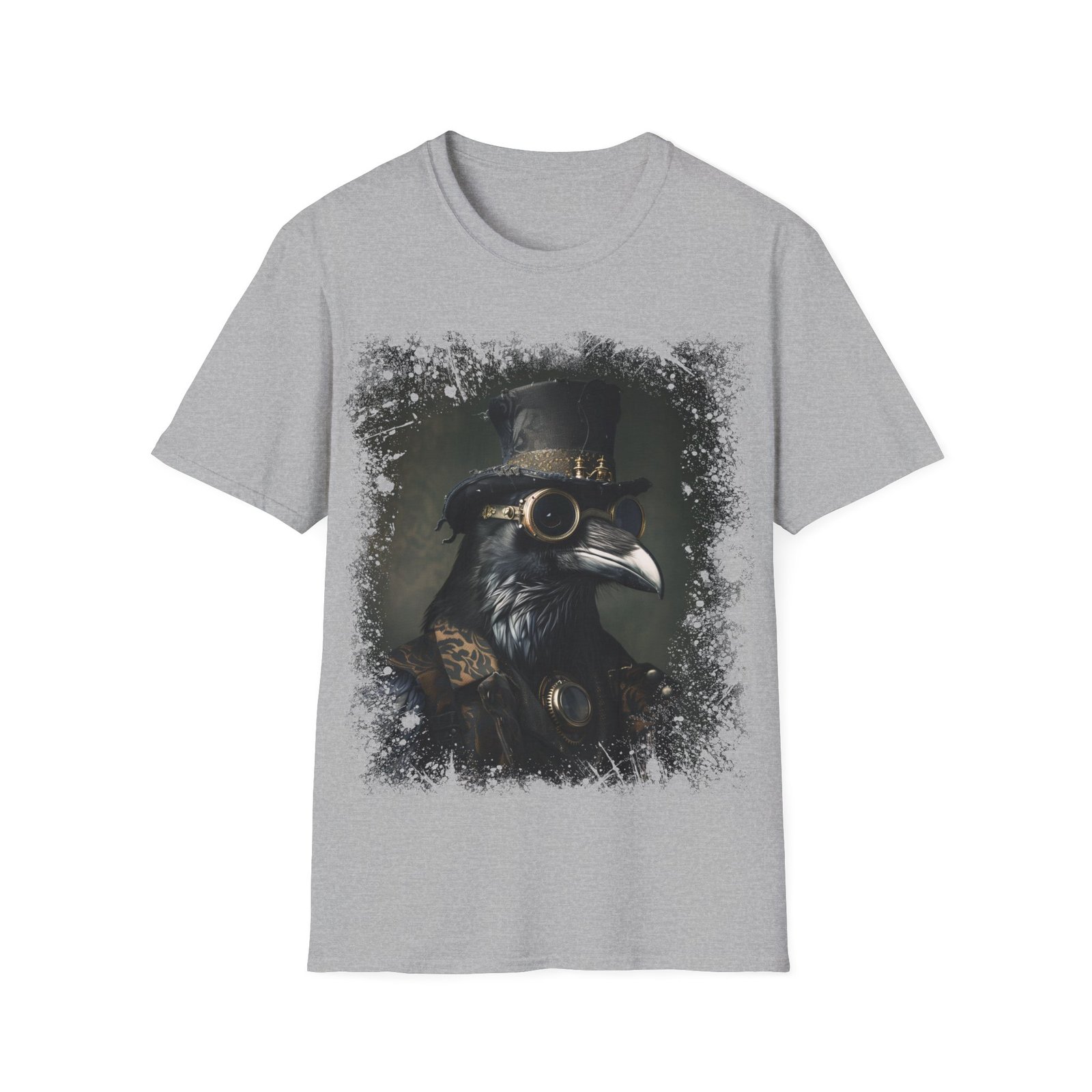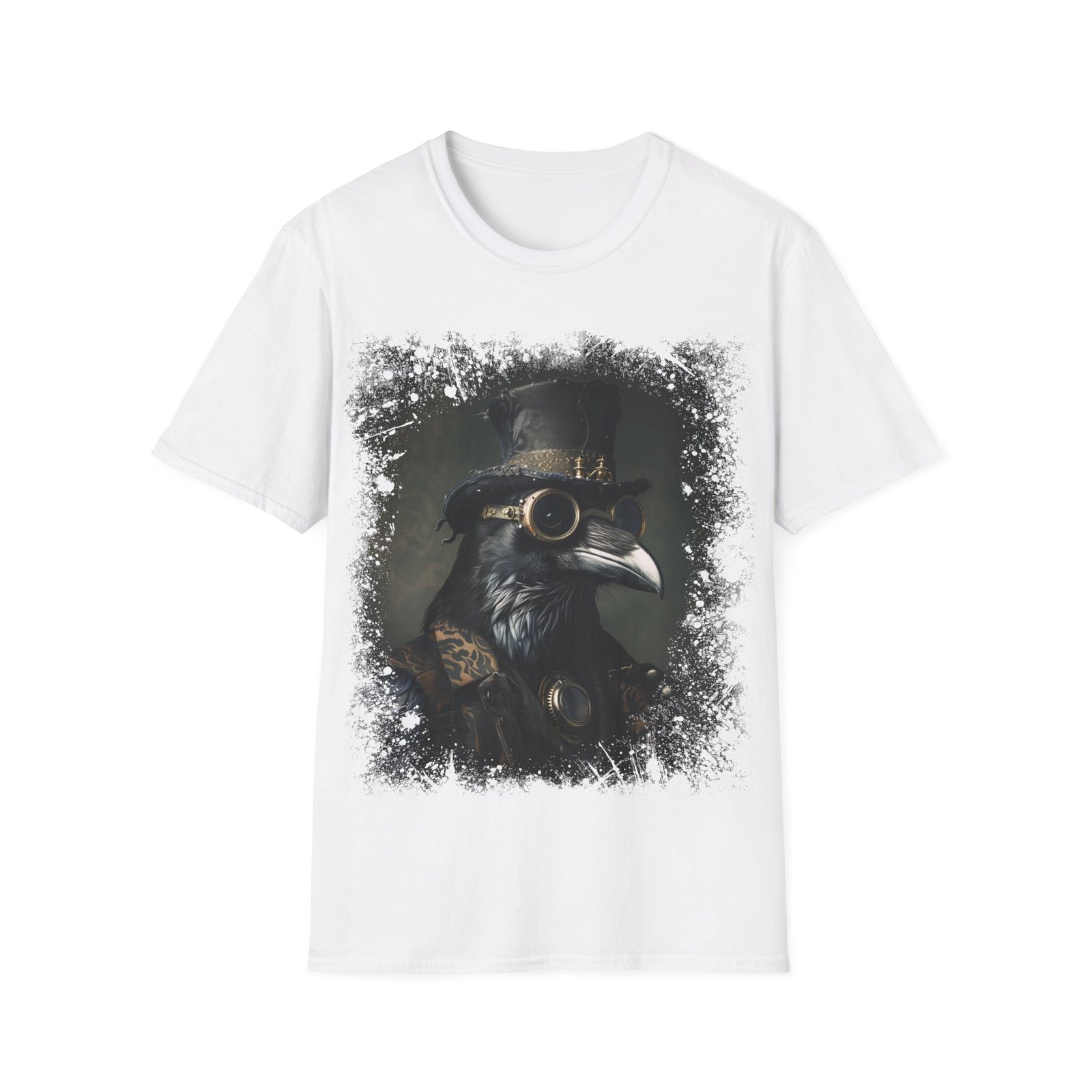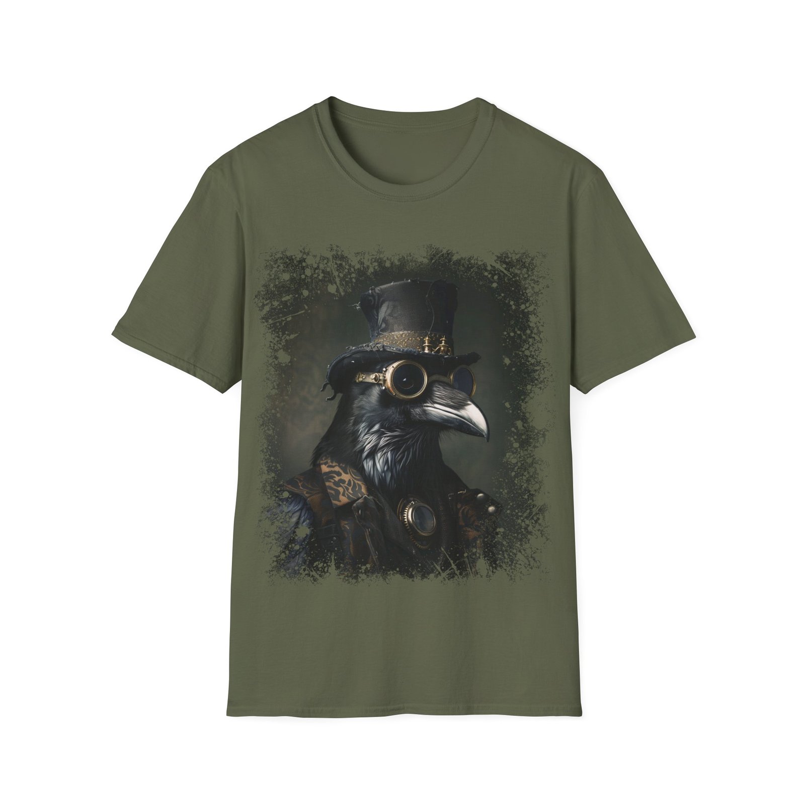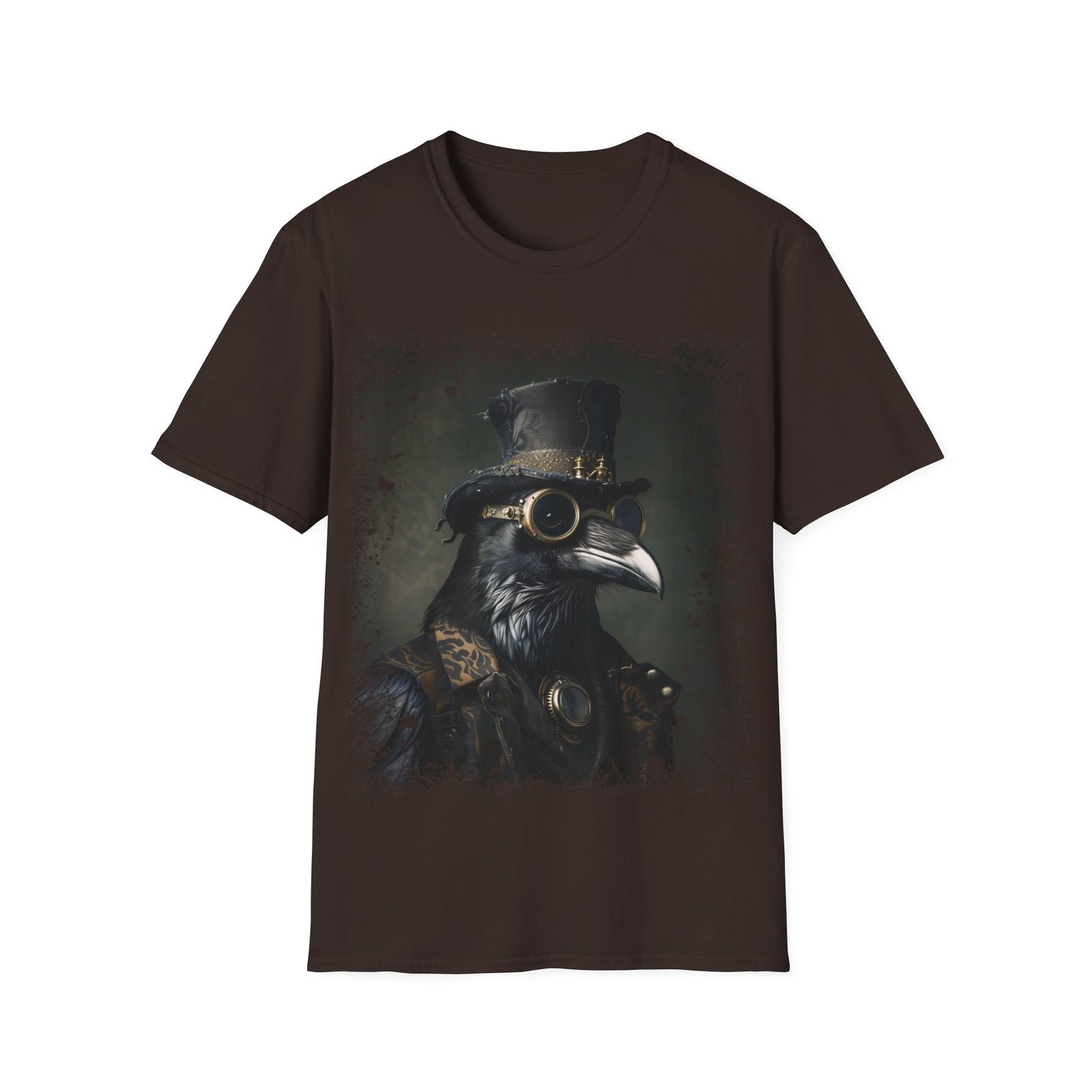 This striking T-shirt showcases a refined portrait of a raven styled in full Victorian steampunk attire. The crow is adorned with a tall, weathered top hat and intricate brass goggles, blending gothic elegance with mechanical detail. Rendered in deep, moody tones with subtle green undertones and textured edges, the design feels like an antique oil painting brought into the modern era.