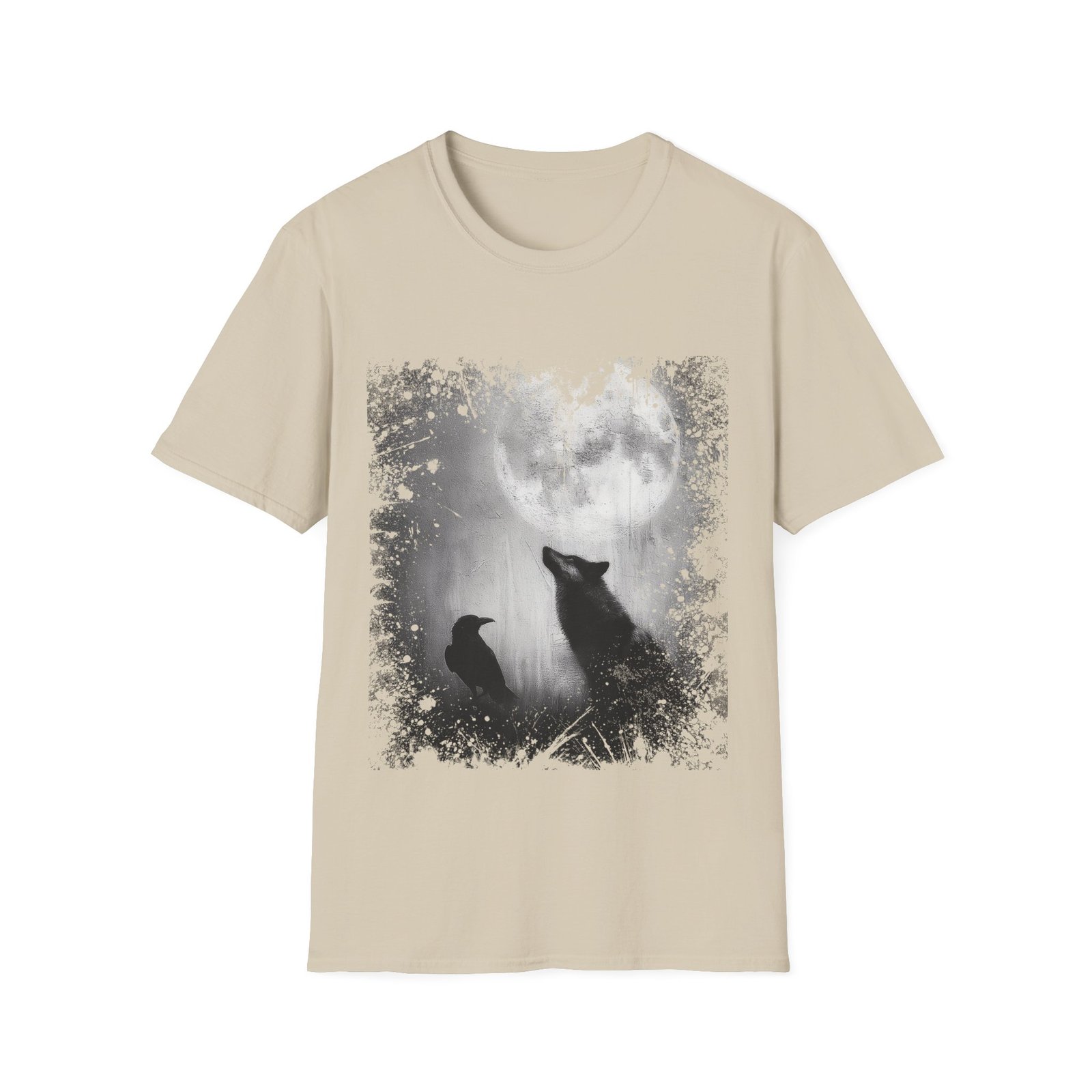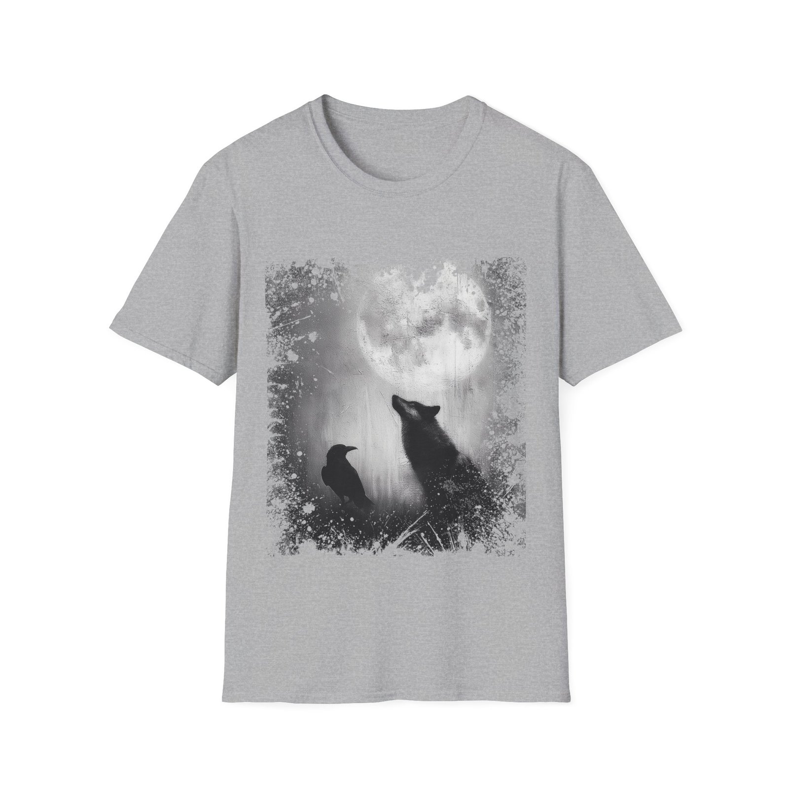 Soft mist and subtle gradient shading create depth within the composition, while distressed ink splatter textures frame the scene like an aged, weathered print. The wolf’s upward posture suggests alertness and intensity, while the raven’s grounded presence adds balance and quiet observation. Together, they form a visually compelling contrast of strength and stillness.