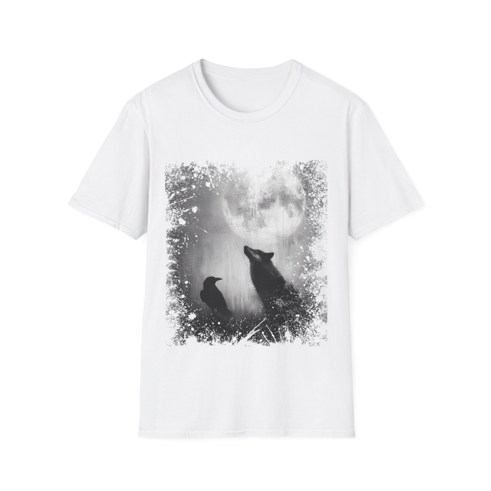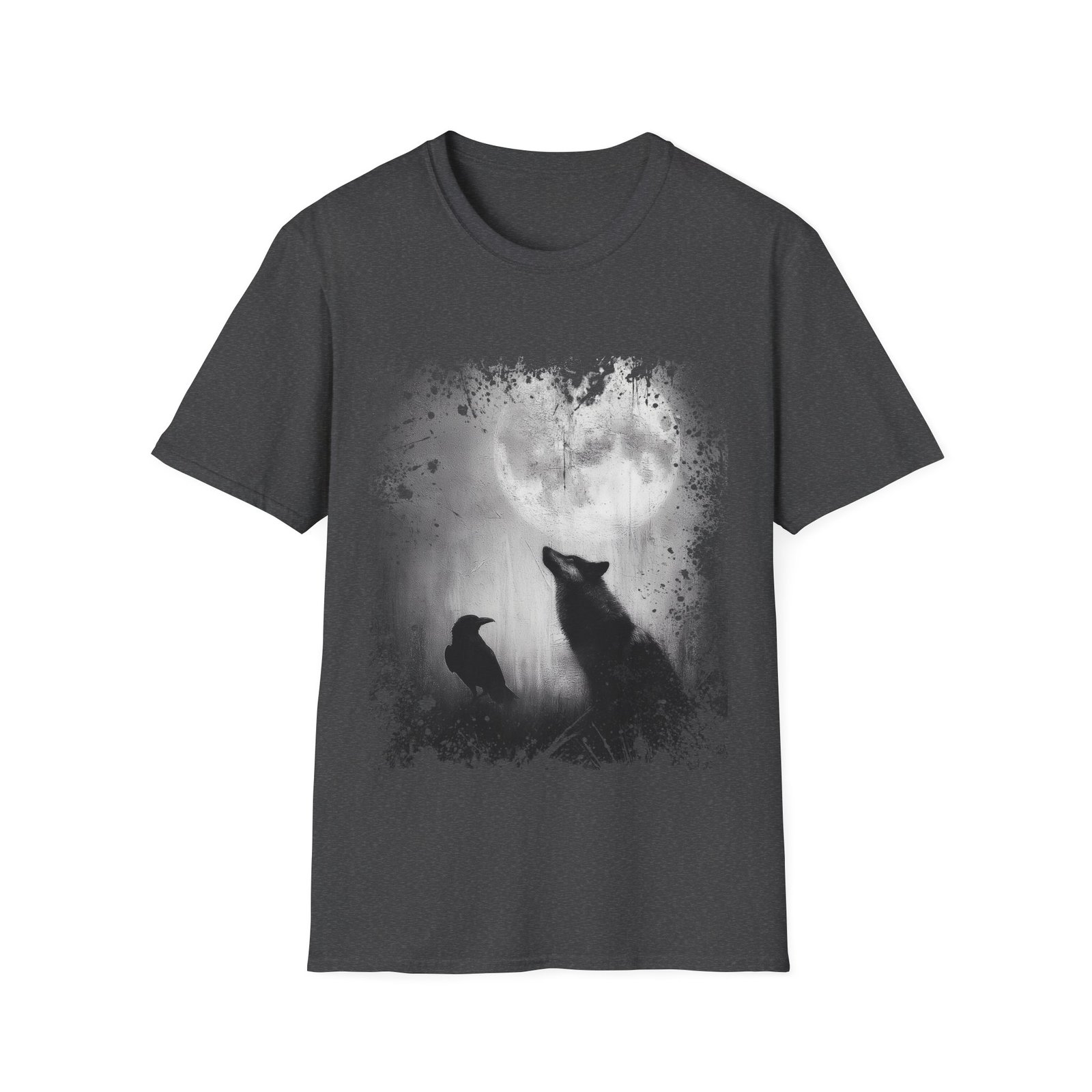 This atmospheric gothic T-shirt captures a powerful nighttime scene — a lone wolf lifting its gaze toward a luminous full moon, with a raven perched nearby in quiet companionship. The artwork is rendered in dramatic grayscale tones, allowing the moon’s glow to illuminate the silhouettes with striking contrast against the black fabric.